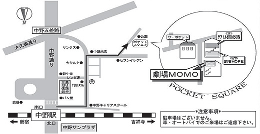 【チケットについて】 前売¥4,000(日時指定全自由席・整理番号付き) 当日\4,000(満席の場合は発売しません) ※未就学児童の方はご入場いただけません。 ※満席の場合、当日券での入場はできません。 ※ご予約のお客様も、座席の確保を解除する場合がございますので、開演時間までにご来場ください。 【チケット予約申し込み】 以下の必要事項をメールにてご連絡ください。 折り返しご確認のご連絡をさせていただきます。 ◇精算・引き替え方法(以下ご選択ください) 【1】当日精算(チケットは当日受付でお渡しします) 【2】事前振込(チケットは振込確認後、郵送いたします) ◇氏名(フルネームで) ◇申し込み枚数 ◇希望公演日時 ◇返信用メールアドレス ◇住所(引き替え方法【2】をご選択の場合) (webmanager@kao-rue.com) ご記入いただいた個人情報はkao-rue.comが責任を持って管理し、 今回公演のチケット購入予約受付のためのみに利用いたします。 【作・演出】 金沢英明×江藤博利 【出演】 江藤博利 大芝孝平 斉木テツ 高間朋世 加藤順子 田中靖教 脇本カオル 松村マサル子 麻生雅人 中野吏深 【劇場】 劇場MOMO JR中央・総武線/東京メトロ東西線「中野駅」南口より徒歩5分 〒164-0001 中野区中野3-22-8 劇場MOMOロビー 03-5385-9080(公演期間中のみ) |